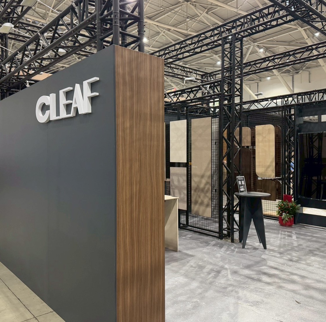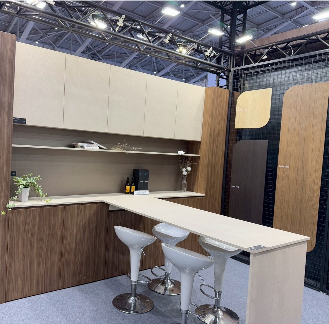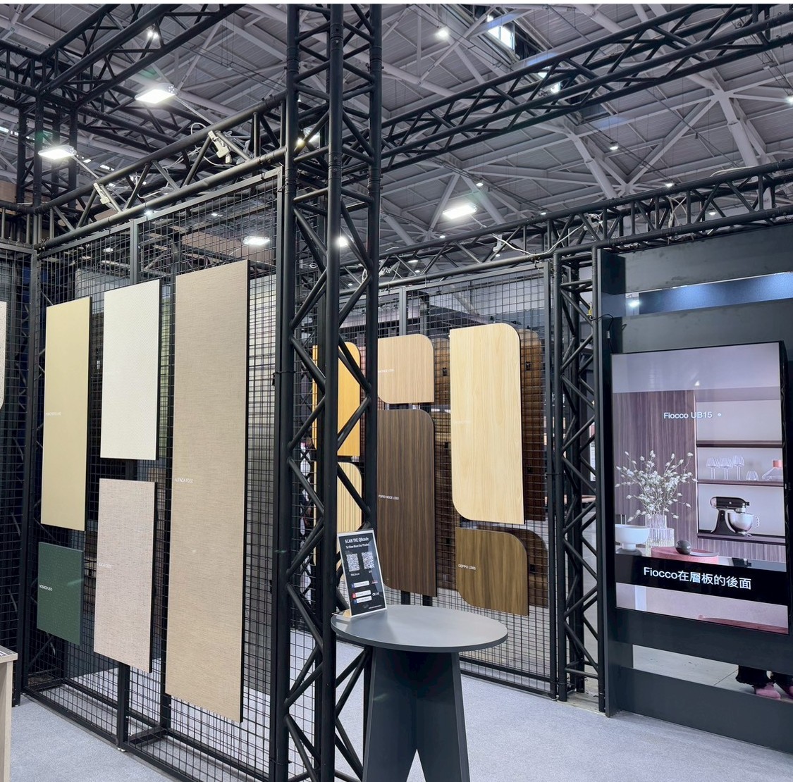 現場展示一座由胡桃木紋和石灰岩石紋的塑合板結合而成情境區,