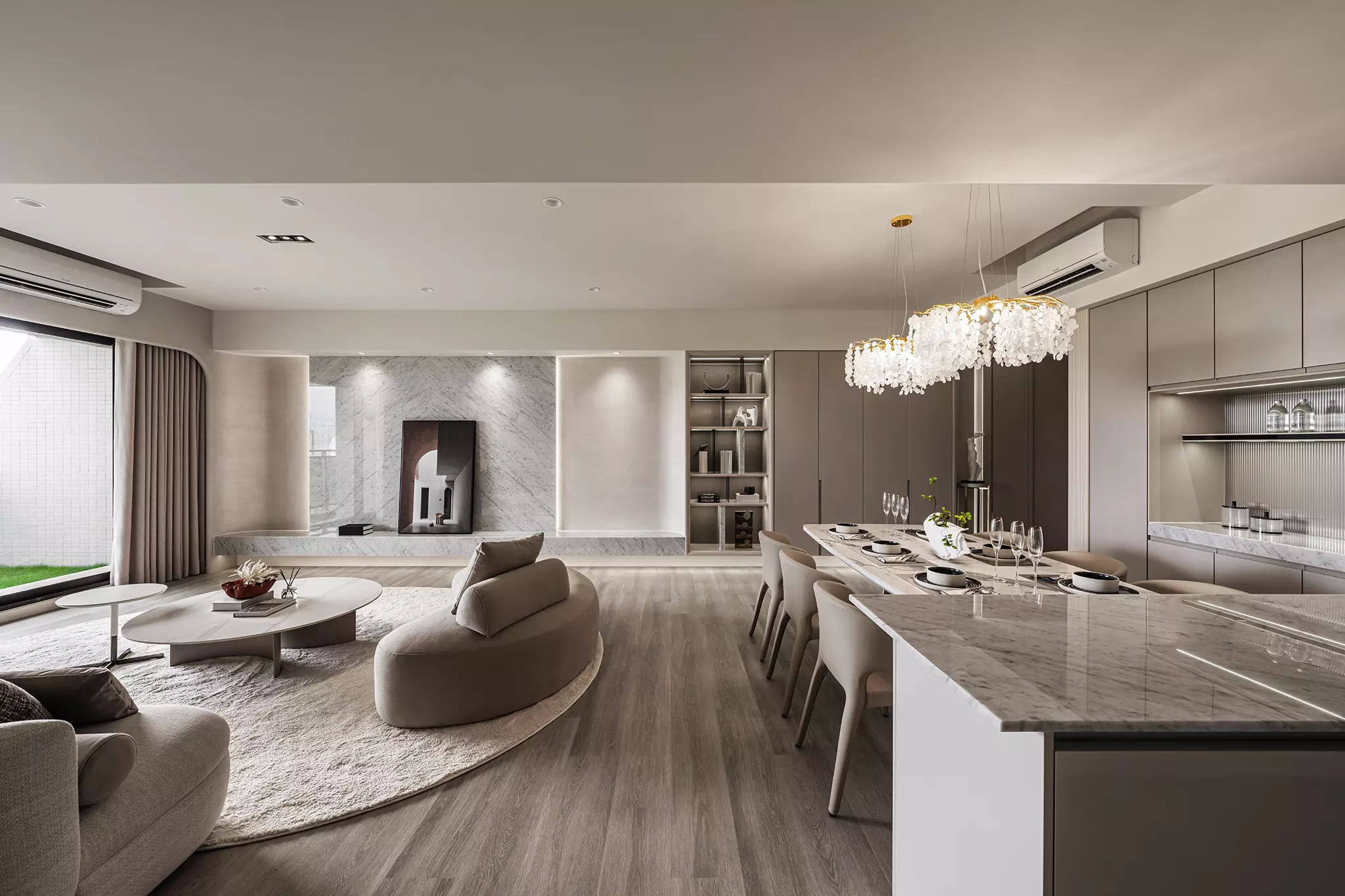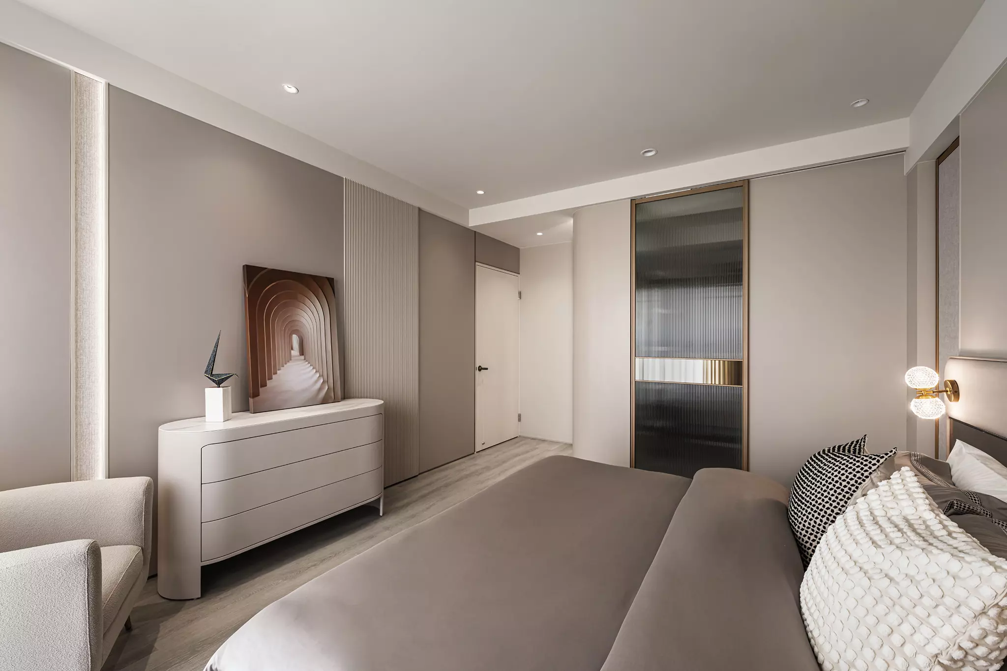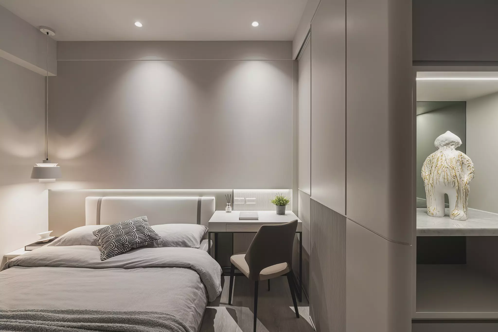 整體以暖米、奶茶色為主軸,空間看似輕盈,